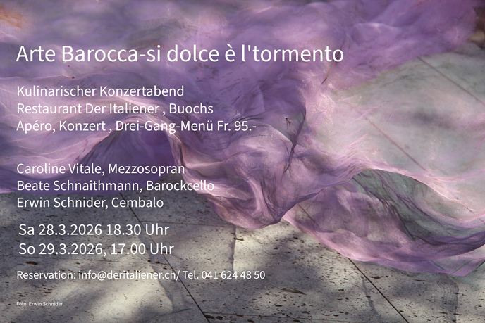 Das versierte Duo Beate Schnaithmann am Barockcello und Erwin Schnider am Cembalo, die sich im Speziellen dem barocken Répértoire widmen, begleiten die Mezzosopranistin Caroline Vitale und spielen Instrumentalwerke.