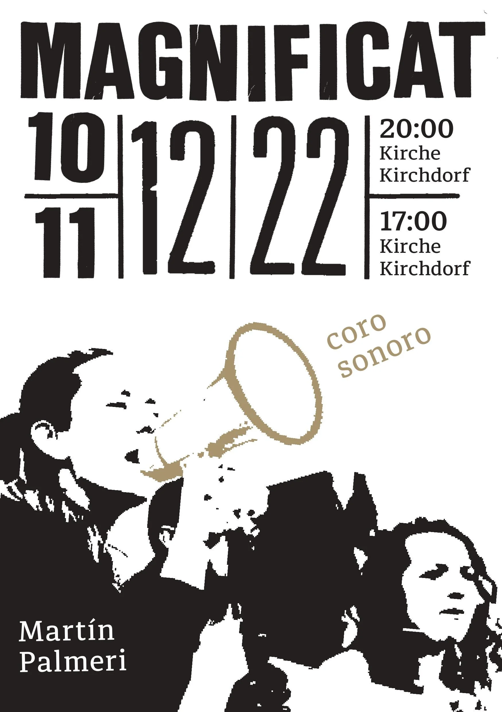 Martin Palmeri, Magnificat Samstag, 10. Dezember 2022 8:00 PM 9:00 PM 20:00 21:00 Kirche Hirschengasse 2 Kirchdorf AG Schweiz (Karte) Google Kalender ICS coro sonoro, Ensemble Tango SalónMargret Sohn LeitungKathrin Lüthi SopranCaroline Vitale Mezzosopran